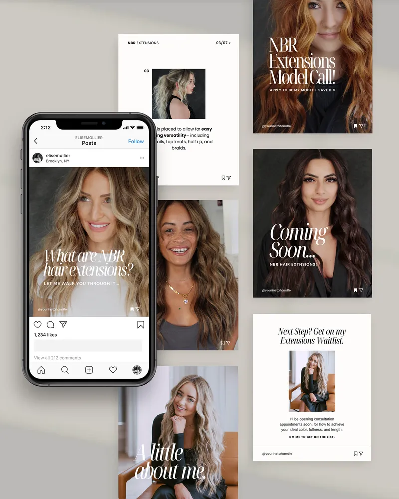 Strategically designed Instagram templates for hairstylists with our signature NBR marketing method in mind—to stop the scroll and wow new prospects. These Canva templates are easy to edit and customize in just minutes!